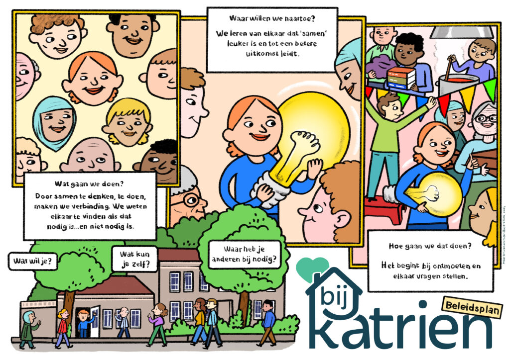 “Bij Katrien is de warme (t)huiskamer in de Bossche binnenstad. We zijn een bruisende ontmoetingsplek vol activiteiten. Een community waarin iedereen elkaar kent, ziet en stimuleert mee te doen vanuit zijn eigen kracht en talent. Dit doen we vanuit wederkerigheid en gelijkwaardigheid. We verzachten de binnenstad, door mensen te laten stralen.”